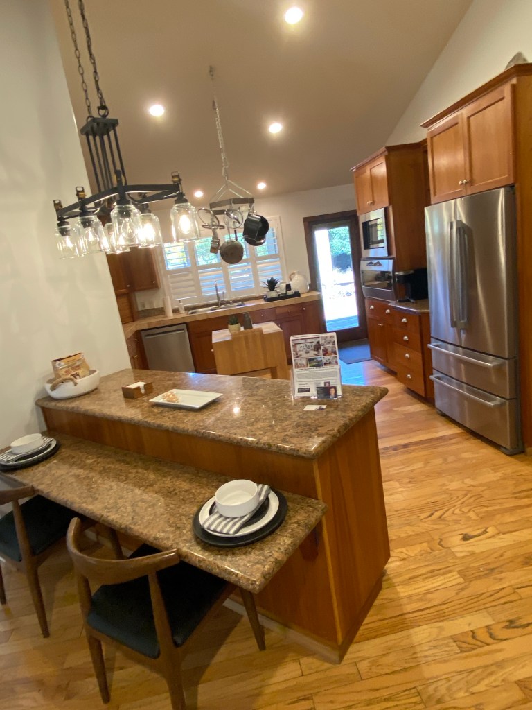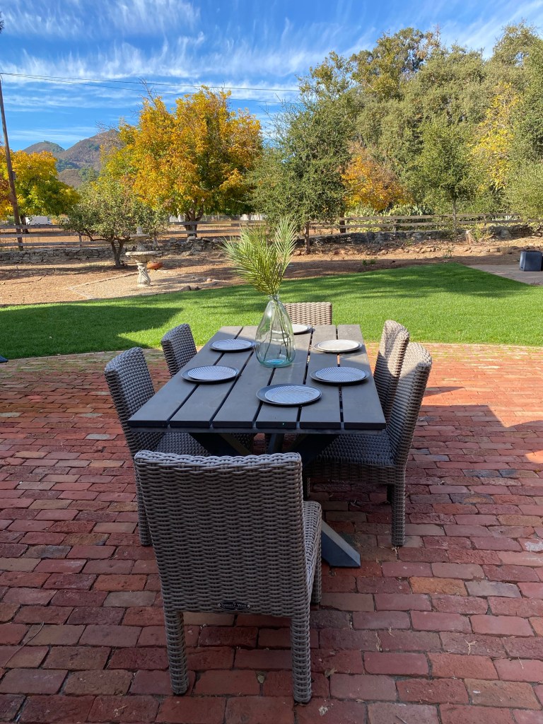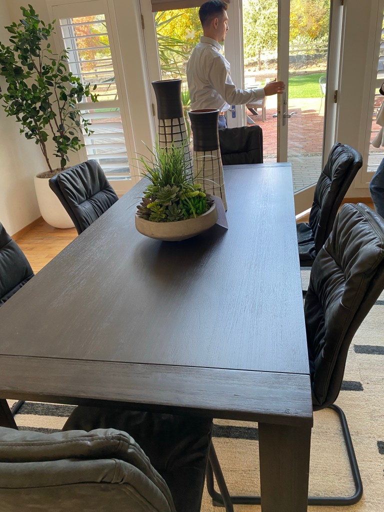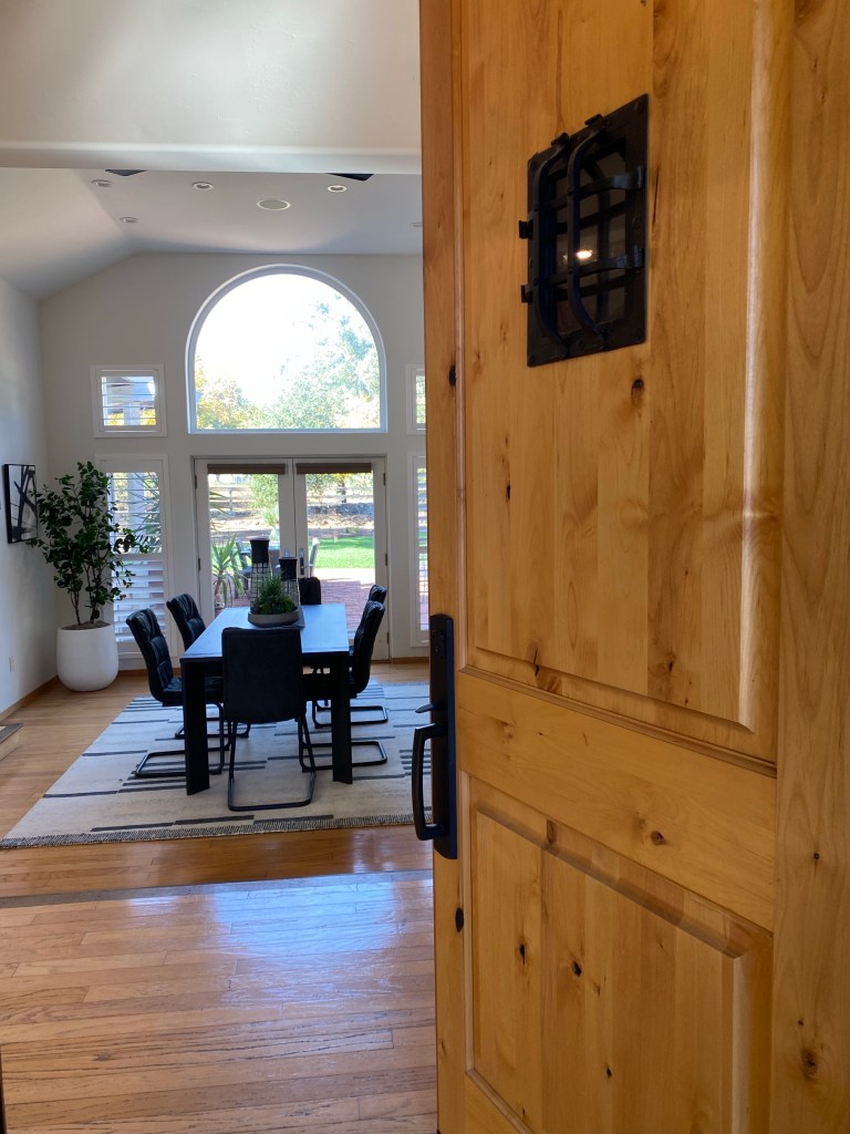 문 열자마자 넓게 펼쳐진 다이닝 테이블과 뒷마당 조경